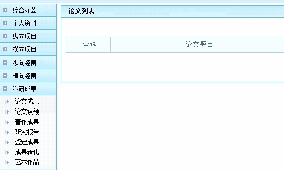 (1)点击系统主页左侧“科研成果”下的“论文成果”;