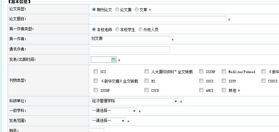 (3)填写论文相关信息,其中打“*”为必填项。另外,为了方便论文审核,请在“附件信息栏”上传论文的电子档,没有电子档的请上传扫描件(包括论文的期刊封面和封底)。没有上传电子档或扫描件的请交一份复印件以供审核。