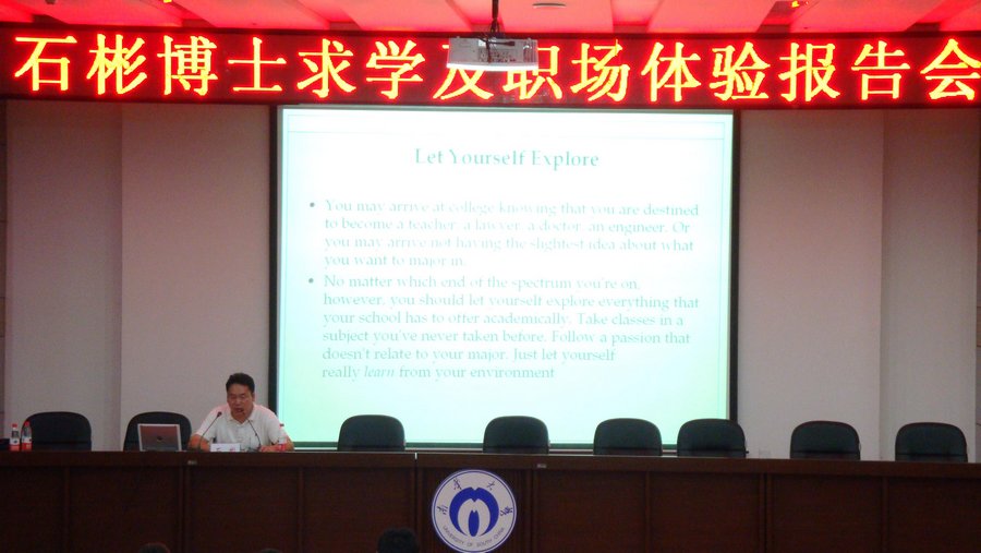 会上,石彬博士通过传授自己的人生经验,让广大师生受益匪浅。他认为,成功=耐心+韧性+勤奋,而且一个人的成就与其在大学时期打下的坚实基础密不可分。为此,石彬博士根据自己在大学生活的体会,向在座同学提出了以下几点建议:1、发掘和保持兴趣与激情,让兴趣变为激情,并且不断去探索与接触新事物;2、学会站在巨人的肩膀上思考问题,这个“巨人”不仅包括成功的人士,还有自己的老师;3、不做“书呆子”,走出书本,学会与人打交道,多参加有意义的社团活动;4、要加强锻炼,拥有健康的身体是革命的本钱。