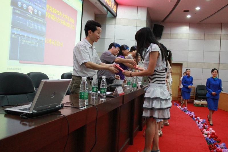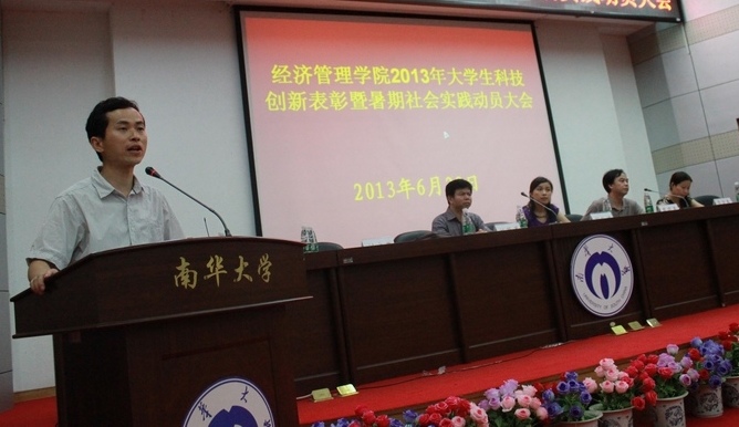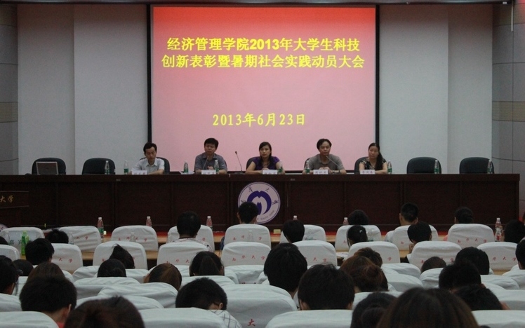 会上,刘文君副院长代表学院做2012-2013学年学生科技创新工作报告。院党委副书记廖迎春老师宣读《经济管理学院关于表彰2013年学生科技创新工作优秀组织与个人的文件》。大会对获奖学生与组织代表进行了表彰,获奖学生代表代玉龙做了典型发言。副院长刘萌芽老师做了题为《基于团队的暑期社会实践,向着“553”的目标奋进》的暑期社会实践动员报告,鼓励大学生确立目标,积极借助暑期社会实践这个平台来锻炼团队协作能力,努力把自己培养成为超优人才。