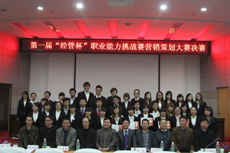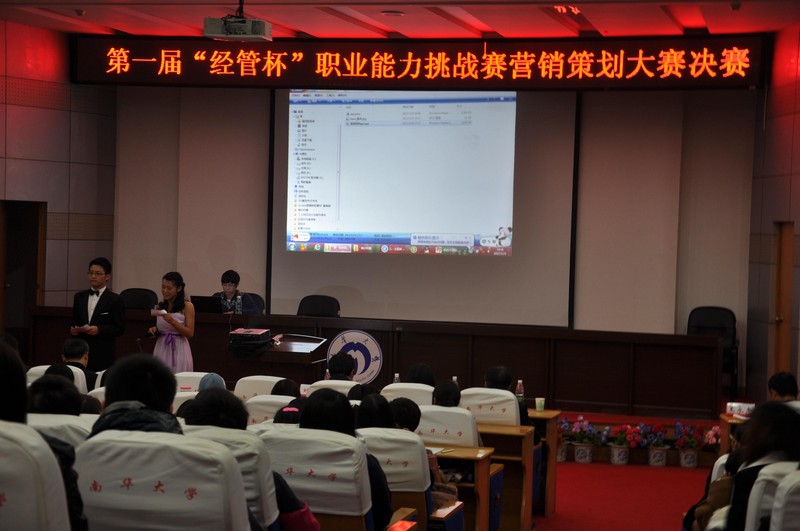 12月8日晚,第一届“经管杯”职业能力挑战赛营销策划赛决赛在红湘校区图书馆报告厅完美落幕。衡阳市移动公司市场项目部经理周琛、校团委书记谢铷鸿、校学工部副部长王永杰、校教务处副处长廖基定、校党委宣传部副部长陈烈作为特邀嘉宾出席了本次活动。经济管理学院党委书记张天成、副院长刘萌芽参加了本次大赛。大赛聘请了刘萌芽、肖汉龙、黄知常、谢荷锋、黎赔肆五位专家担任评委。
