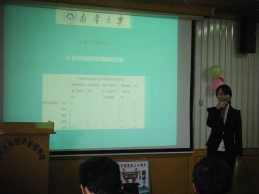 根据大赛的规则,四位评委老师当场评出决赛的获奖作品:高展等同学的《国民宗教信仰与生活满意度关系调研》获一等奖;李祥等同学的《创业失败者东山再起:社会网络是如何演化的》和刘炯等同学的《湖南农地流转对农民收入影响的实证分析》获二等奖;易婉君等同学的《一种便携式件货配送货架》、留惠芳等同学的《湖南省农村合作医疗实施情况》和涂婧等同学的《衡阳市民间金融风险研究分析》获三等奖;《“速马”自行动力宝》、《我国农村地区信息消费市场特征的分析与研究》、《关于农民专业合作社发展的思考》和《大学生网络暴力问题调查分析》四份作品获优胜奖。
