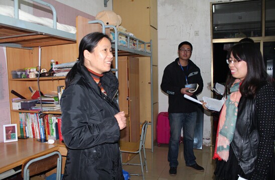 廖书记一行看望了323、401、410等宿舍。走进323室,干净整洁的宿舍让人心情舒畅。一张张床铺上,方方正正的被子同向摆放;一个个书柜上,琳琅满目的图书整理排列,毛绒娃娃等屋内饰品更为宿舍增添活泼的气氛。张贴壁纸的401宿舍以淡绿为主色调,清新淡雅中流露着温馨的感觉。410宿舍各成员都布置了床帘,天蓝的色调营造着梦幻的氛围。该宿舍各成员用喜爱的装饰品、玩具、个人照片装点着自己书桌前的“小天地”,活泼而又富有个性。