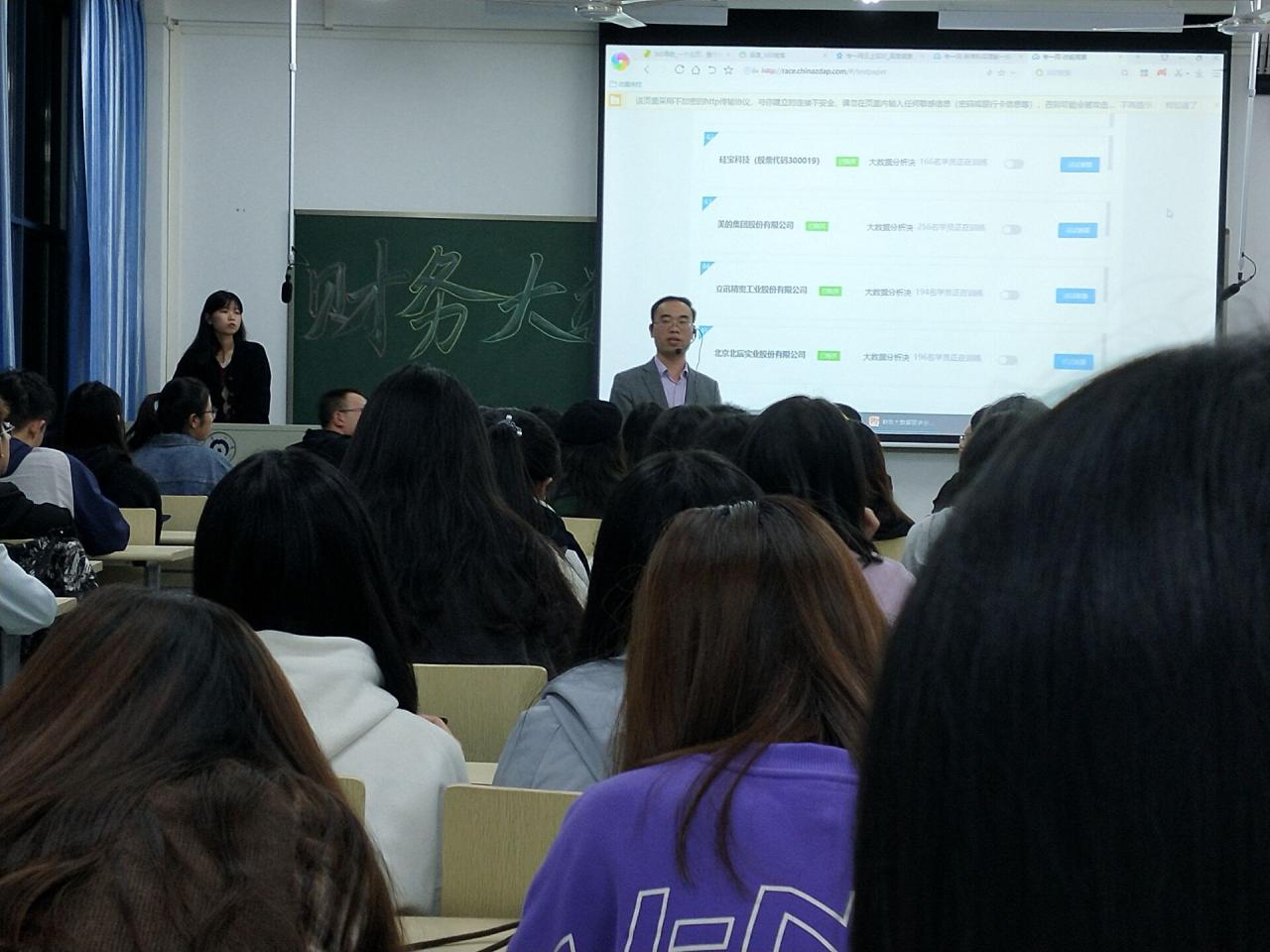 唐洋老师对财务大数据赛事进行了简单介绍,并大致讲述了这次大赛的参赛情况,为原本对大赛概念模糊不清的同学们作了明确的分析,并鼓励大家积极参与。