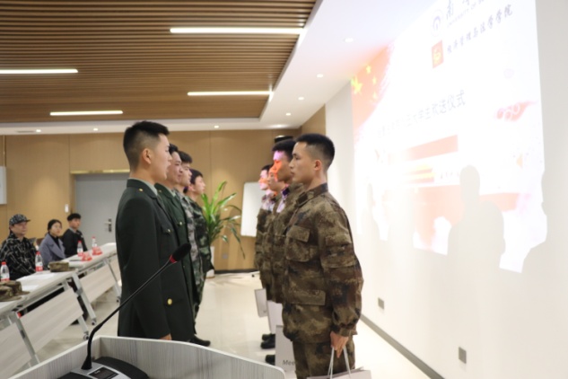 仪式开幕,与会人员全体起立,奏唱国歌。之后,作为退伍回校代表,田峥对即将入伍的新兵们分享了自己的经验。他对国家、军队和学校表达了由衷的感谢。他认为,参军入伍的目的是要锻炼自身的能力和意志,只有拿好手中的枪杆子,才能更好的保卫祖国,保护亲人。