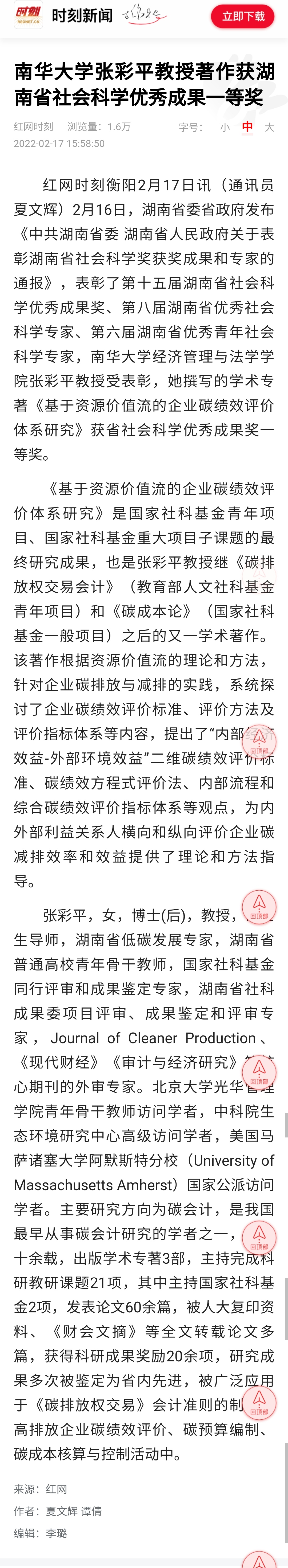 红网时刻衡阳2月17日讯(通讯员 夏文辉)2月16日,湖南省委省政府发布《中共湖南省委 湖南省人民政府关于表彰湖南省社会科学奖获奖成果和专家的通报》,表彰了第十五届湖南省社会科学优秀成果奖、第八届湖南省优秀社会科学专家、第六届湖南省优秀青年社会科学专家,PA电子,PA电子,PA电子张彩平教授受表彰,她撰写的学术专著《基于资源价值流的企业碳绩效评价体系研究》获省社会科学优秀成果奖一等奖。