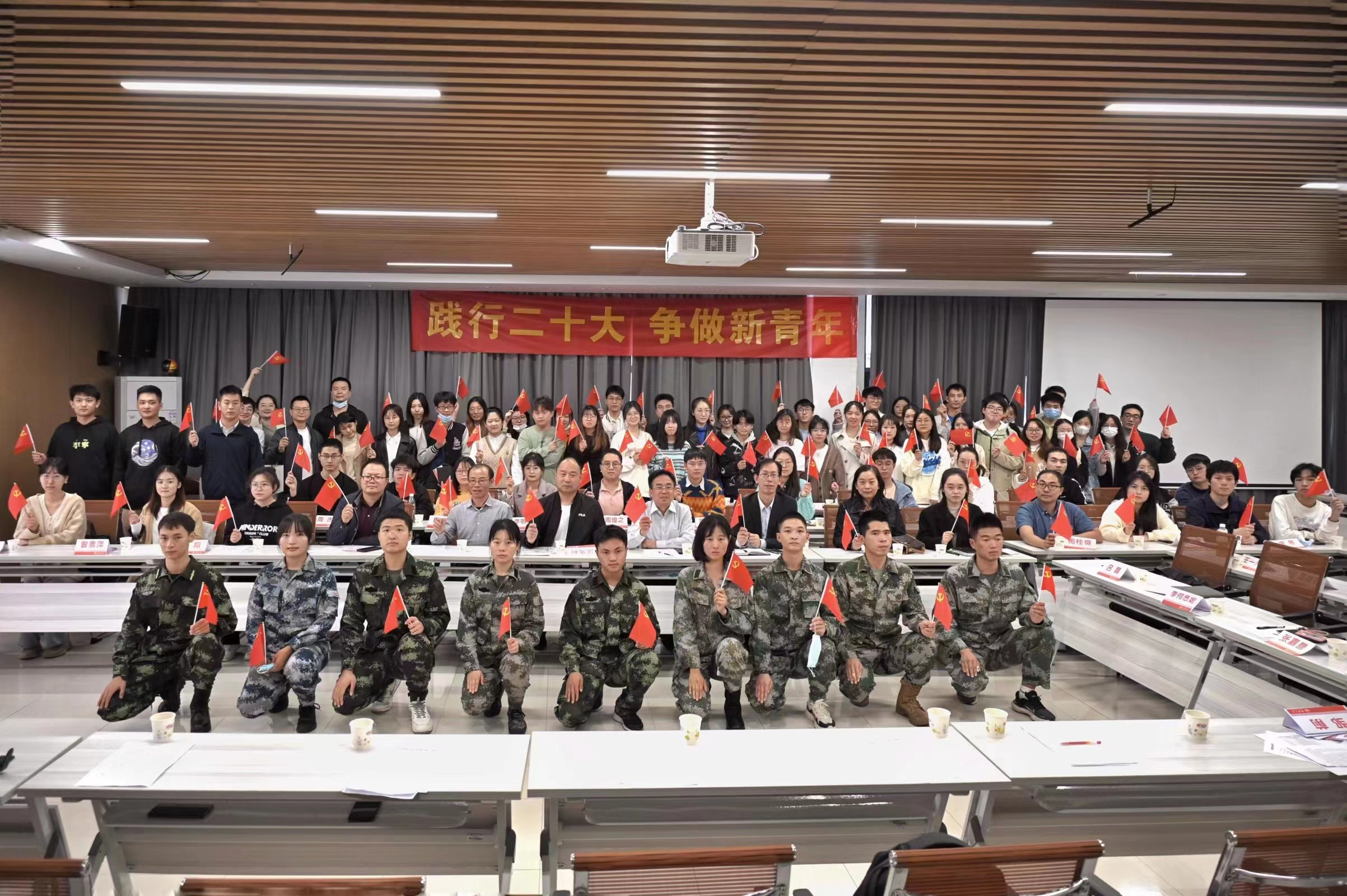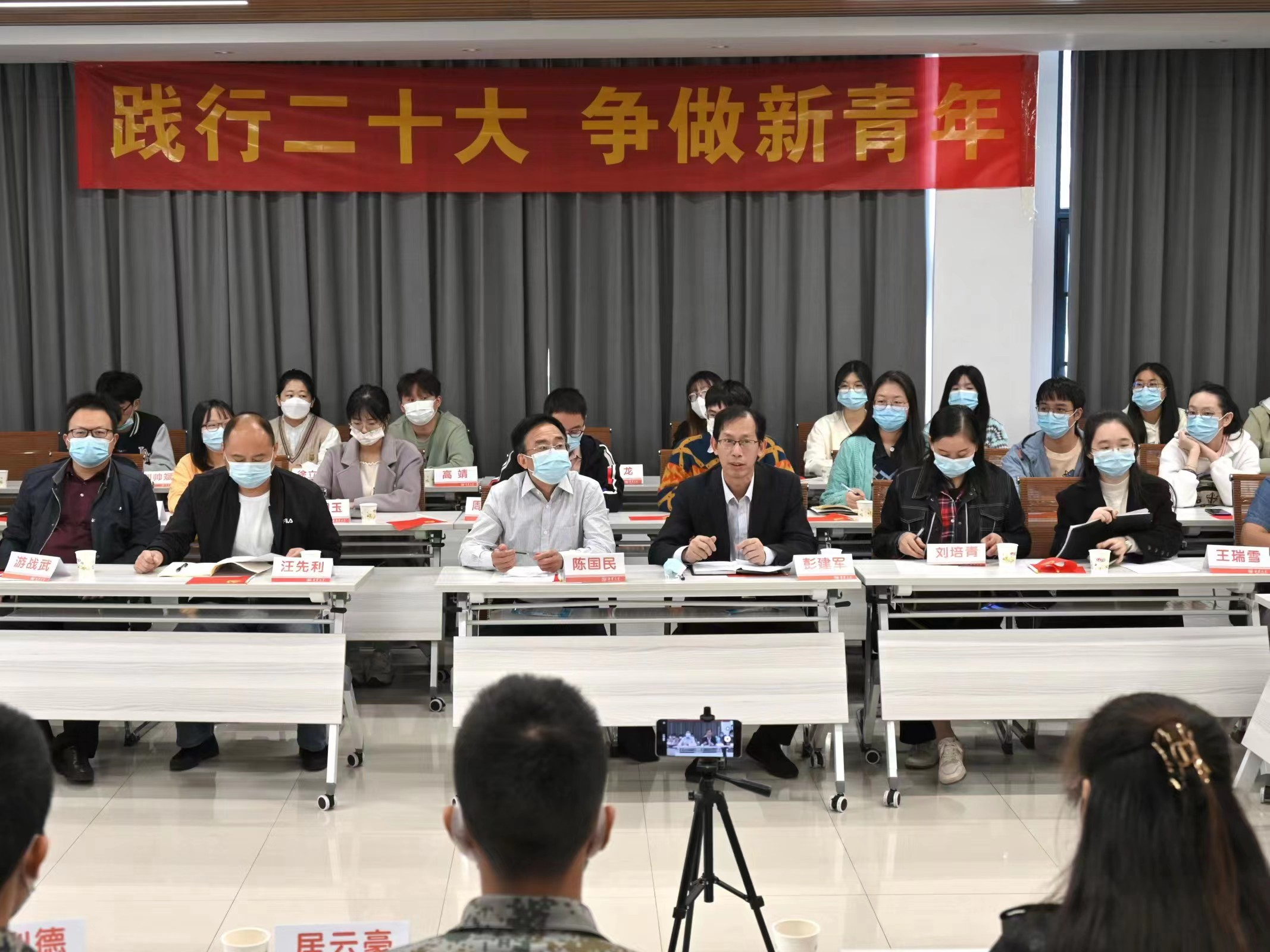 最后,陈国民发表讲话。他强调,要把学习宣传贯彻党的二十大精神作为当前和今后一个时期的首要政治任务,持续学深悟透大会核心要义和精神实质,自觉把思想和行动统一到党的二十大精神上来。对于新一代青年,陈国民用三句话表达期冀,一是“坚定理想跟党走”,青年是祖国的未来,应怀揣梦想,既仰望星空,又脚踏实地。坚定不移听党话,跟党走;二是“好好学习练本领”,要带着问题学,深入实践学,联系实际学;学有所思、学有所悟,学有所获;三是“全面发展担大任”,要注重“德智体美劳”全面发展,人人争做“有理想,敢担当,能吃苦,肯奋斗”的新时代好青年!