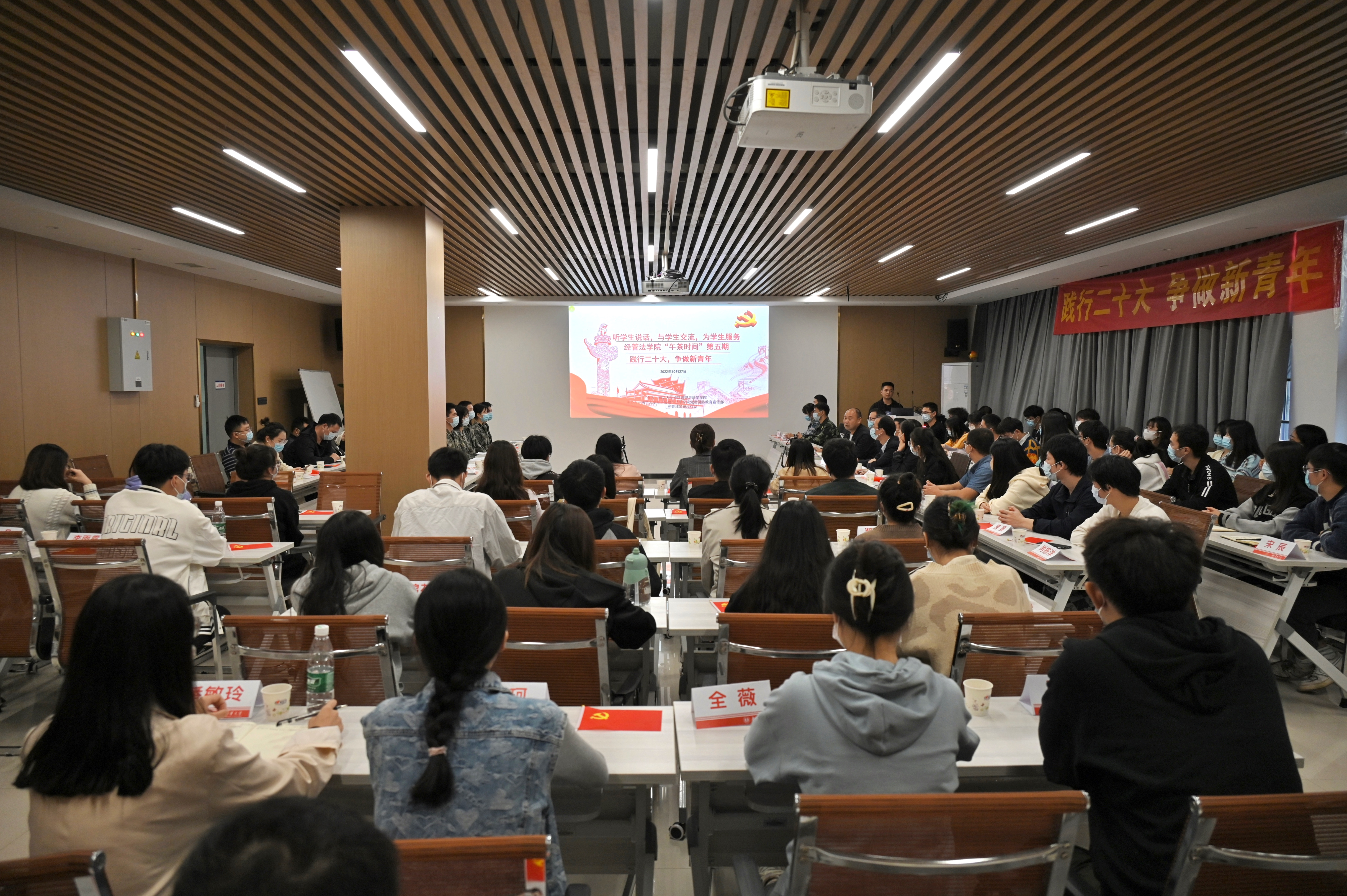 10月27日下午,为全面贯彻二十大精神,PA电子,PA电子,PA电子“午茶时间”第五期围绕“践行二十大 争做新青年”这一主题开展座谈。参加会议并发言的有献身国防刚刚光荣退伍复学的“老兵”,有热心教育深入乡村义务支教的“志愿者”,有勤奋上进顺利保送研究生的“学霸”,有身处逆境却矢志不移勇毅前行的“自强之星”。出席本次活动的有副校长陈国民、院党委书记彭建军、院党委副书记谭德明、全院所有教职工党支部书记及优秀学生代表,会议由彭建军主持。