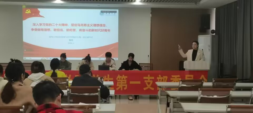 会上,支部书记甄晴带头讲党课。甄晴老师以“深入学习党的二十大精神,坚定马克思主义理想信念”为主题,结合身边优秀党员的先进事迹,将主题党课讲述地绘声绘色。在党课活动中,甄晴老师提出,支部党员要学习“敢作敢为、善作善成”的品质,争做有理想、敢担当、能吃苦、肯奋斗的新时代好青年。