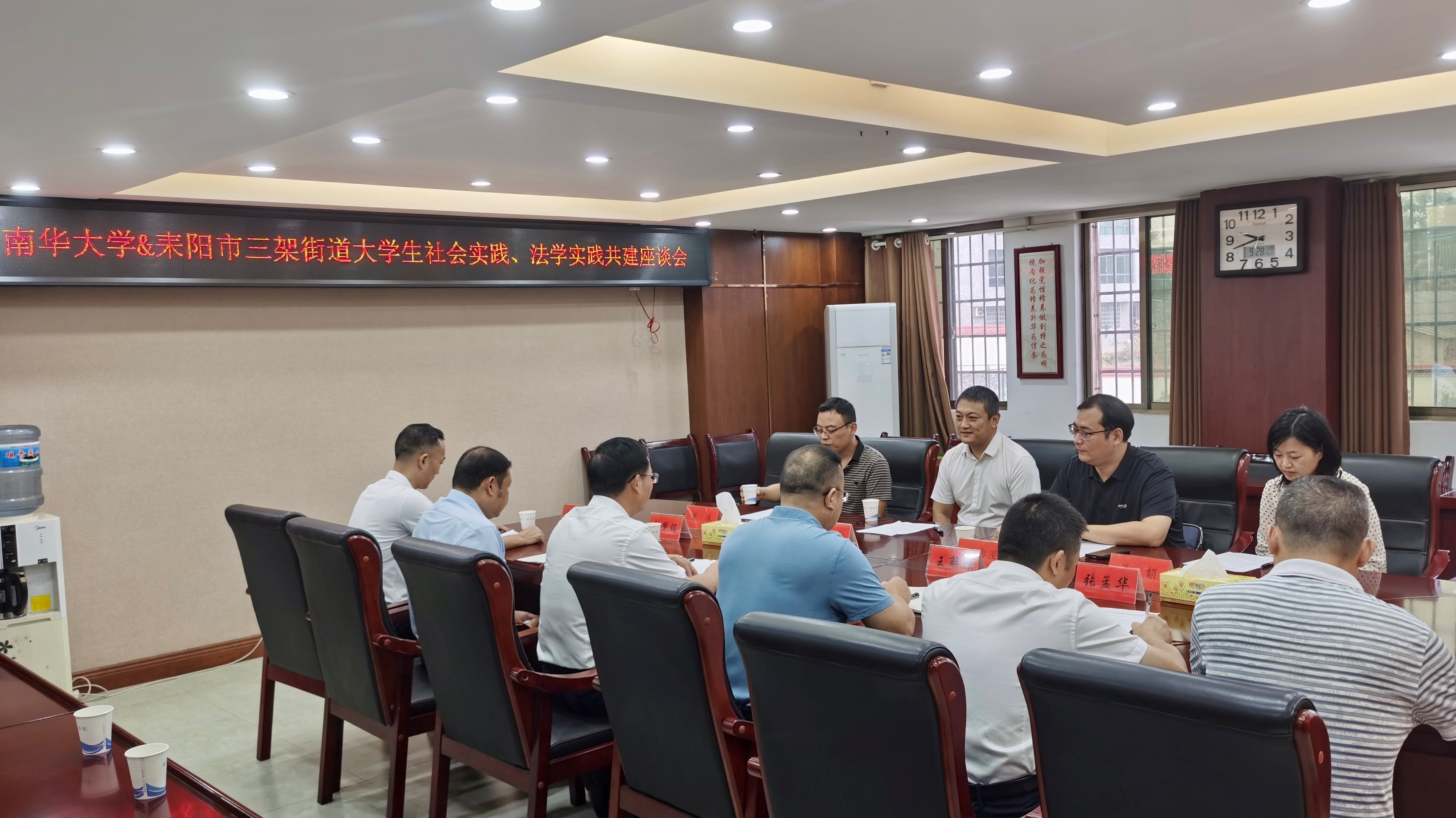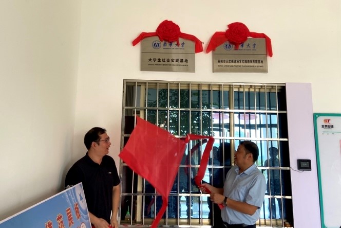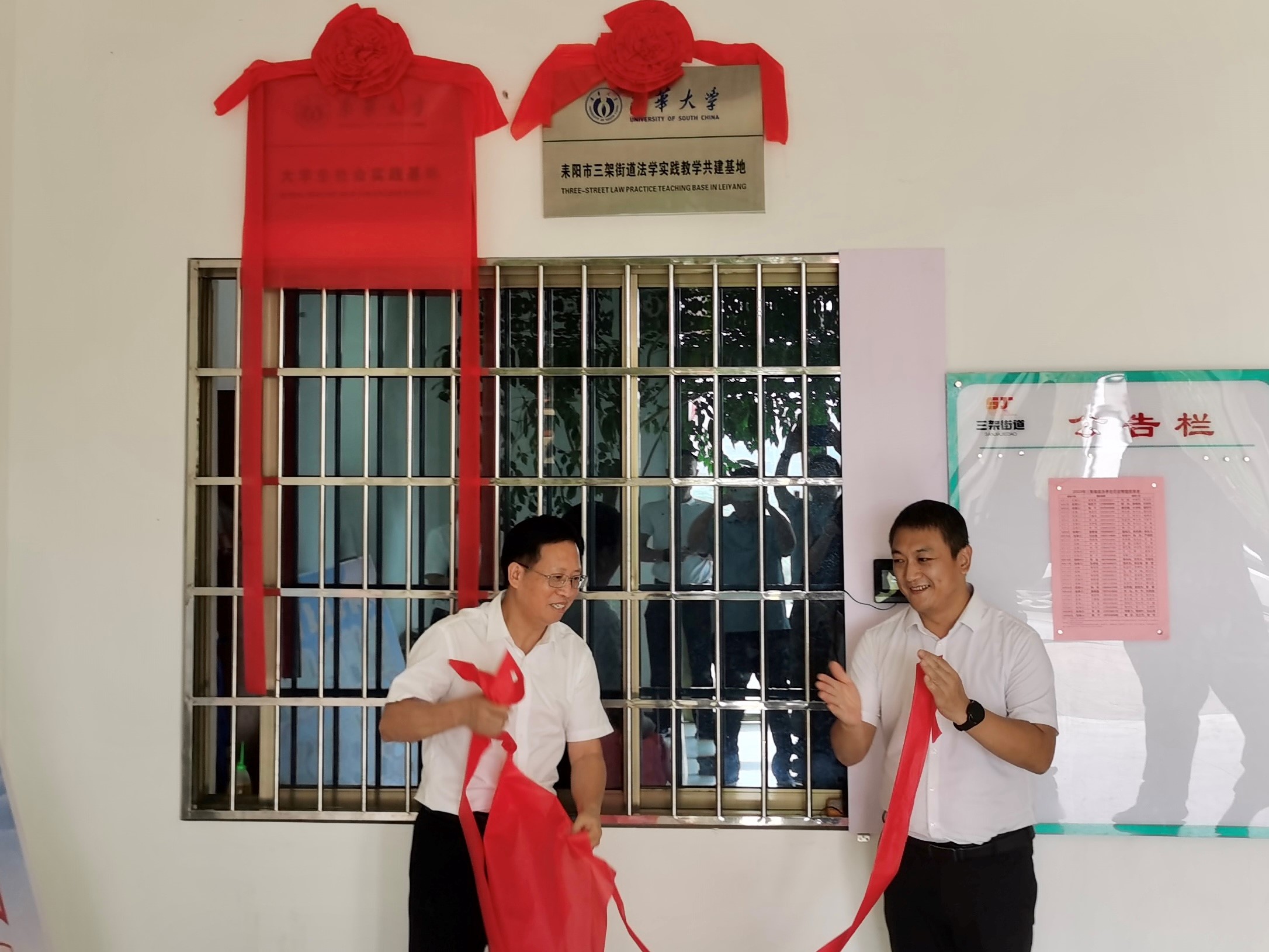 学院党委书记胡海波与街道党工委书记曹爱明共同为“PA电子——耒阳市三架街道法学实践教学共建基地”揭牌。