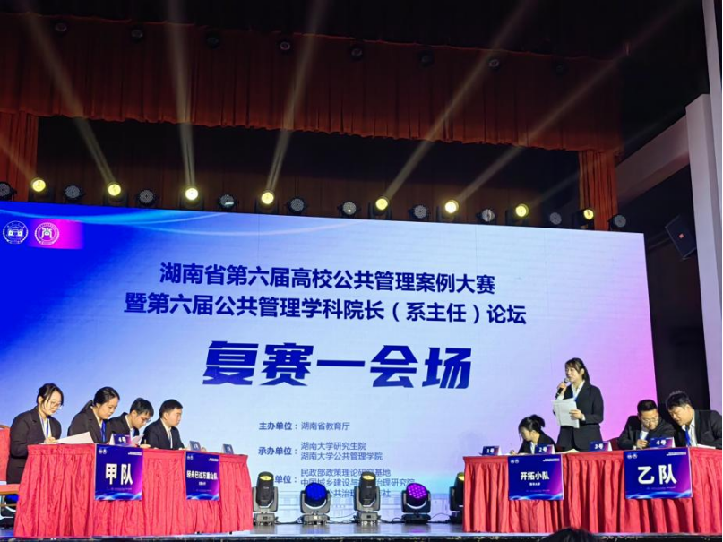 在决赛环节,我校“开拓小队”与中南大学的“小马拉大车队”和“数字化小分队”、湖南师范大学的“我说的都队”、湖南大学的“大江南北队”、湘潭大学的“粒粒皆辛苦队”进行同台角逐。此次比赛中,我校参赛队员台风稳重、案例讲述条理清晰,获得了评委的一致好评。在后期的观众和评委提问环节,我校队员沉着应对,对答如流,展示出了南华公管人的优秀素养和专业知识储备。