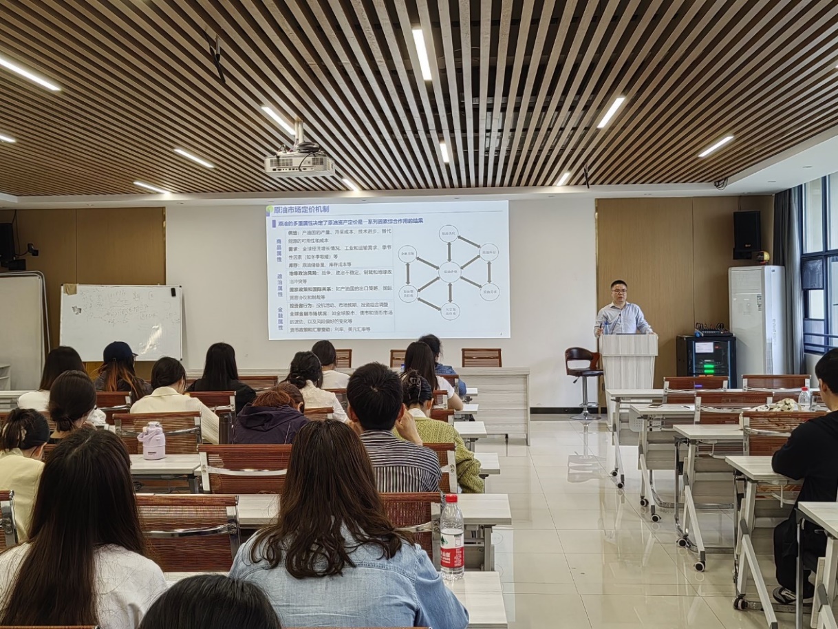 讲座中,张跃军教授详细阐释了国际油价波动对我国经济发展影响,通过多篇论文举例向大家揭示新形势下国际原油资产定价机制和当前原油资产定价呈现新的特征,从地缘政治、双碳约束对原油需求、投资者预期等方面探讨了对国际原油定价的影响,提出运用信息化技术研究原油资产定价。