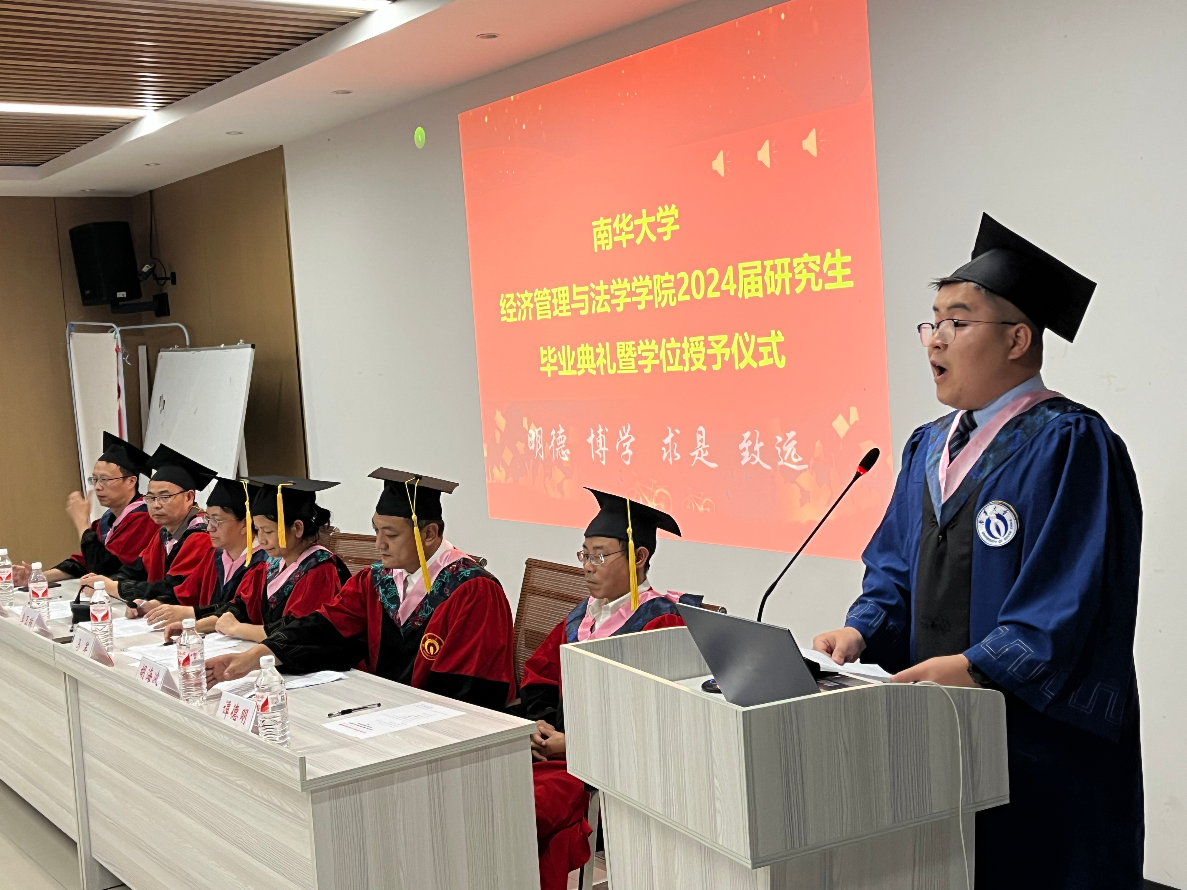 在庄严的国歌声中,毕业典礼正式开始。党委研究生工作部部长马军宣读硕士学位获得者名单,祝贺189名学子顺利毕业。接着,学院副院长李冬生宣读优秀毕业生名单,他希望同学们脚踏实地,向优秀的人学习,不断超越自己。