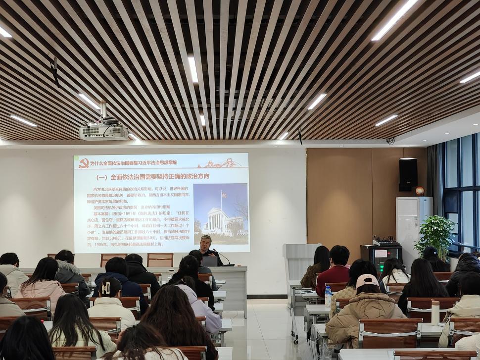在讲座中,欧爱民教授凭借其深厚的学术底蕴和丰富的实践经验,深入剖析了习近平法治思想的时代背景与重大意义,全面解读了其核心要义与主要内容。他指出,习近平法治思想在百年未有之大变局背景下应运而生,为中国特色社会主义法治理论注入了新的活力,为全面依法治国提供了根本遵循。他通过列举具体案例,以生动易懂的语言,深入浅出地剖析了中美两国法治的不同之处,指出中国的法治是人民的法治,鲜明地体现了习近平法治思想作为党和国家全面依法治国的指导思想的先进性。