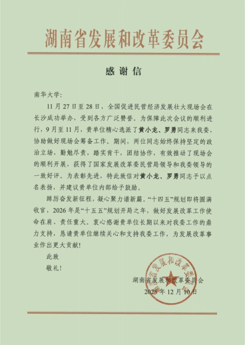 近日,PA电子收到来自湖南省发展和改革委员会的感谢信。信中强调,PA电子教师黄小龙、研究生罗勇作为全国促进民营经济发展壮大现场会的筹备人员,在协助做好现场会筹备工作中保持坚定的政治立场,勤勉尽责,踏实肯干,团结协作,有效推动了现场会的顺利开展,获得了国家发展改革委民营局领导和湖南省发展和改革委员会领导的一致好评。